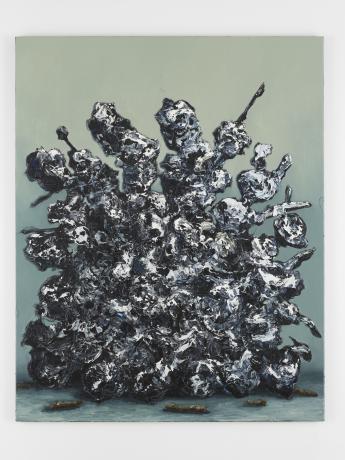 Such an object might be a bit like a distorted mass of skulls on spikes, a model of a ballerina, a fan of sectioned wood, a lump of agate, a box, a giant fabric balloon, a woodwork block with a chisel resting on it, a lump of clay sectioned with wire. It may be a vase of blooms, overdaubed, overflowing their container. It may be a branch adorned with hanging objects. It may be some kind of watch, but not a watch that has surely ever been worn, its wrist-strap is stretched, strange, somehow snakelike, perhaps reverting to the animal that gave up its skin. The strangeness of the objects, the fact that they don’t quite correlate with anything in the real world, is what they are about. They speak to us stylistically of classical painting – and their technical composition is, to this untrained eye, seriously impressive – but their content speaks of something altogether different.